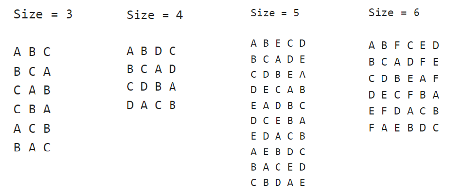 When the number of treatment n is an even number, we could use the below row as the first row of a Latin square. It covers all treatments from 0 to n-1. The differences between two adjacent treatments are calculated, as highlighted in the following picture. The differences highlighted in blue are 1, 3, 5, 7, 9, etc., we could easily identify that they are all odd numbers, and they are in an increased trend.