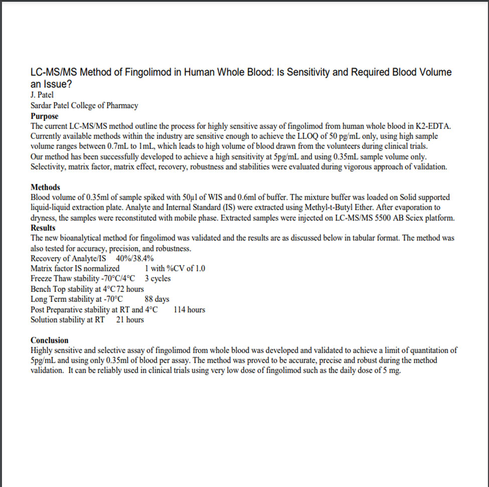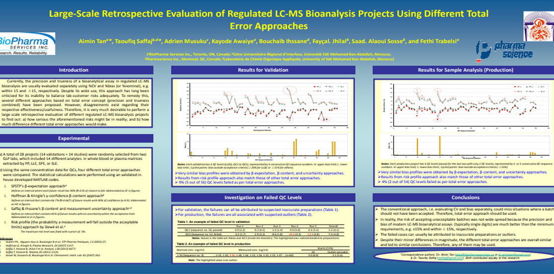 Aimin Tan, Taoufiq Saffaj, Adrien Musuku, Kayode Awaiye, Bouchaib Ihssane, Fayçal Jhilal, Saad. Alaoui Sosse, Fethi Trabelsi. Large-Scale Retrospective Evaluation of Regulated Liquid Chromatography-Mass Spectrometry Bioanalysis Projects Using Different Total Error Approaches. Journal of Chromatography B, 983-984 (2015) 68-75.